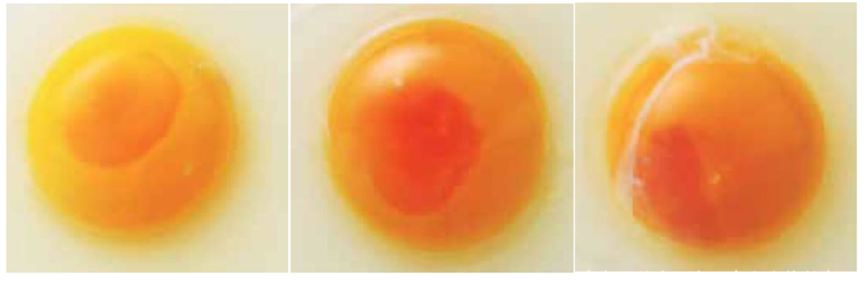 有研究發現,有的蛋黃表面的顏色會發生局部變化,形成不同形狀大小的黃斑。據研究報道,至少有一半的蛋黃表面有一定大小的黃斑,這些是由于滲透壓的增加和卵黃膜的弱化從而導致水分從白蛋白遷移到蛋黃中。除了鈣缺乏,單寧酸和尼卡巴嗪(一種用于預防球蟲感染的藥物)誘發黃斑的可能性外,儲存過程中的振動也會影響黃斑的形成,并且更有可能出現當雞蛋在較高溫度下儲存時。這些斑點的存在不影響食用,但可能會降低雞蛋的商品價值。