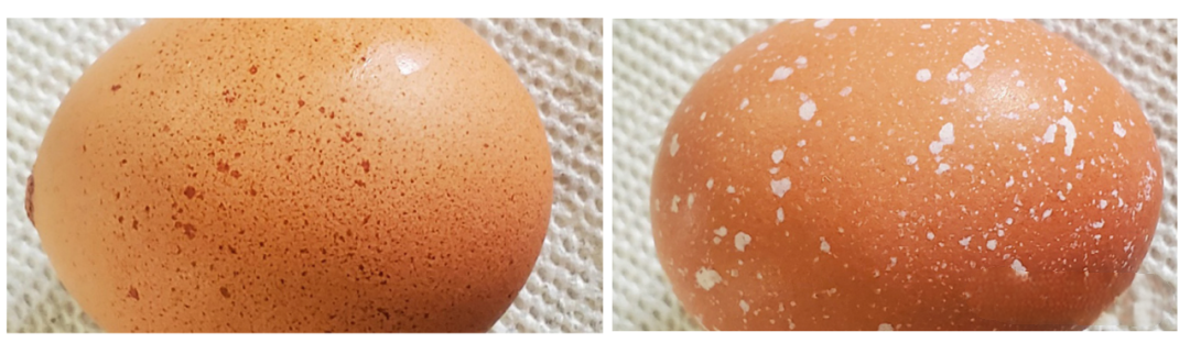 長啥樣:蛋殼上有少量白色或褐色的斑點 —— 這些斑點也是由少量的鈣沉積形成的,是在卵殼腺中角皮層形成之前出現(xiàn)的。(有的蛋雞品種產的蛋本來就有斑點,不過這里描述的斑點蛋屬于不正常的情況。)