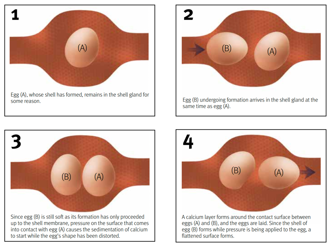 長啥樣:蛋的一側被壓扁了。這是由于第二枚雞蛋跑太快,在前面那枚雞蛋離開前就進入卵殼腺,這時候,因為第二枚雞蛋還沒完全鈣化,所以接觸第一個雞蛋的那一面就被壓扁了。